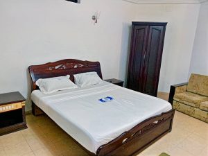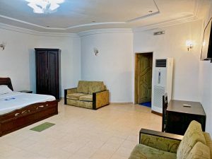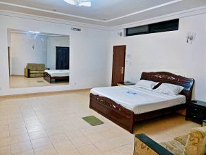 Chambre VIP Photo Chambres climatisée avec lit 3 places Table de chevet avec boutons commande Armoire de rangement Frigo bar Télévision Table (bureau)+chaise Salle d'eau dotée de chauffe-eau, et de jacuzzi Canapé,Miroir Murale Coffre-fort 86.000F La Nuitée
